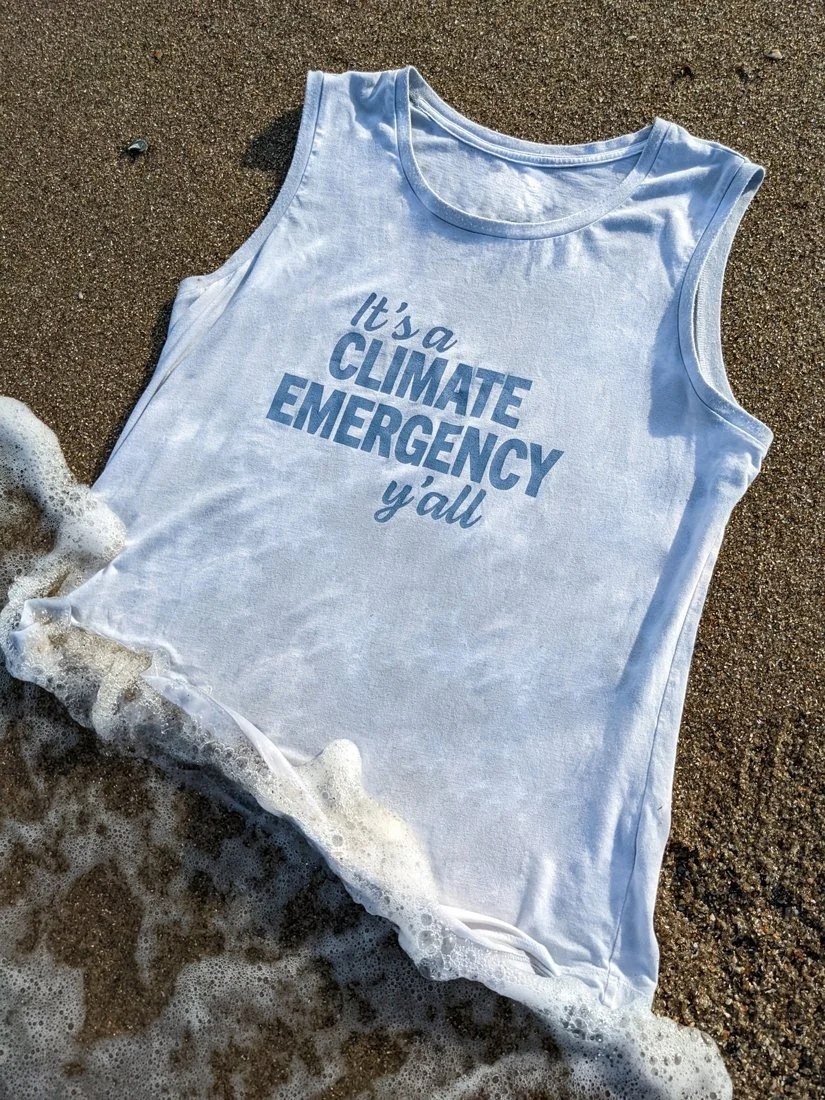 Cause for Alarm is a social action project to bring more urgency to the climate crisis through culture and collaboration. Climate messages are printed on stickers and hand-printed on quality thrifted t-shirts.